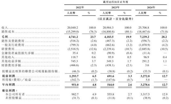 豪威集团2022年、2023年、2024年年内利润分别为9.51亿元、5.44亿元、32.79亿元;年内利润率分别为4.8%、2.6%、12.7%。